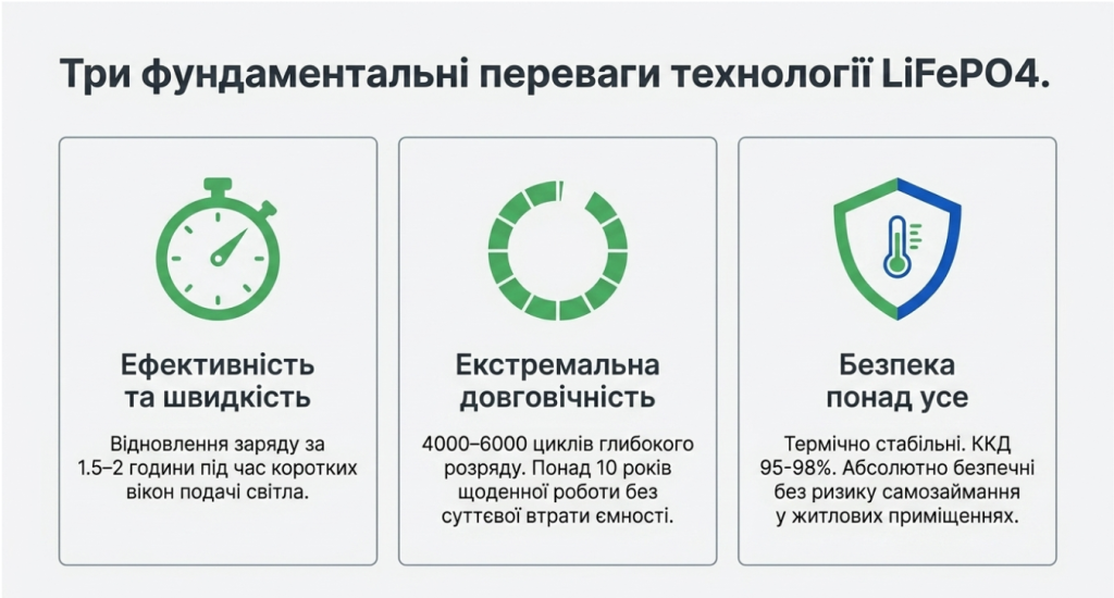 Такі батареї мають ККД близько 95-98%. Крім того, вони підтримують високі струми заряду, що дозволяє відновити енергію за 1.5–2 години, що критично важливо під час коротких вікон подачі електроенергії.