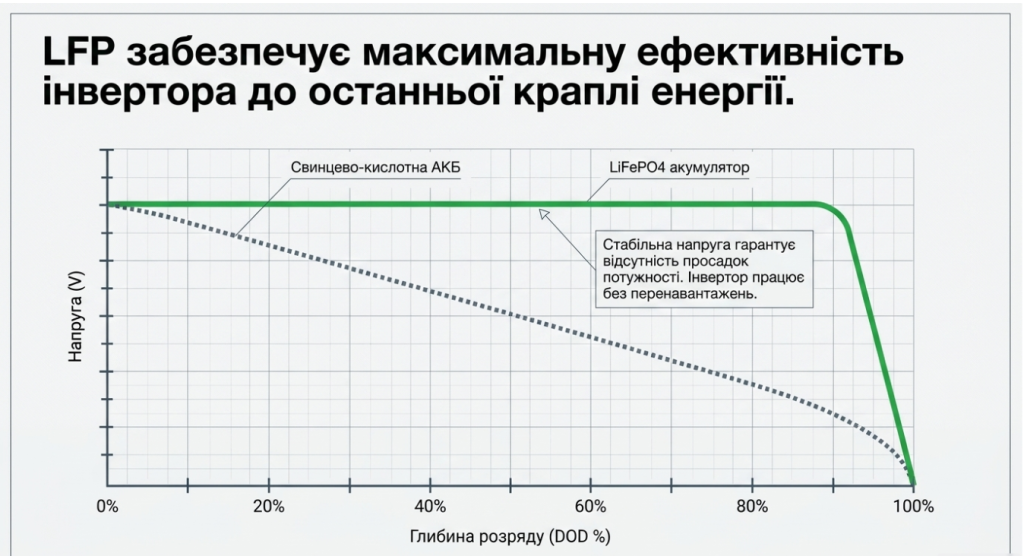 Використовуючи акумуляторні батареї LiFePO4 для інвертора, ви отримуєте стабільну напругу протягом майже всього циклу розряду. На відміну від свинцевих батарей, де напруга стрімко падає, LFP тримає робочі показники до останніх 5-10% заряду. Це дозволяє інвертору працювати в максимально ефективному режимі.