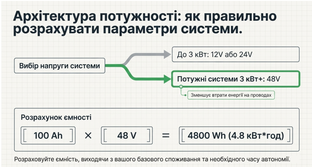 - Напруга системи: Найчастіше використовуються рішення на 12V, 24V або 48V. Для потужних систем (від 3 кВт і вище) рекомендується переходити на 48-вольтні збірки для зменшення втрат на проводах.