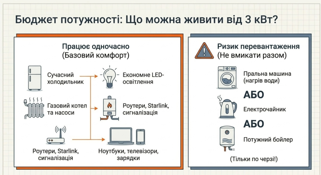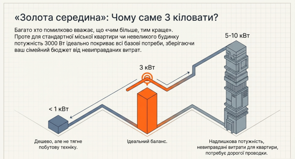 Вибір правильної потужності — це ключовий етап при плануванні резервного живлення. Багато людей помилково вважають, що чим більше — тим краще, і намагаються придбати обладнання на 5, 8 чи навіть 10 кВт. Проте для стандартної міської квартири або невеликого приватного будинку це часто призводить до значних і абсолютно невиправданих витрат. Потужності у 3000 Вт цілком достатньо для покриття основних побутових потреб і підтримки дуже комфортного рівня життя.