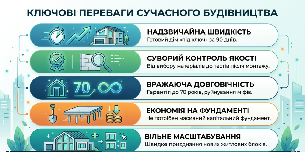 - Надзвичайно висока швидкість реалізації, адже ваш сучасний дім може бути повністю готовий за 90 днів під ключ.